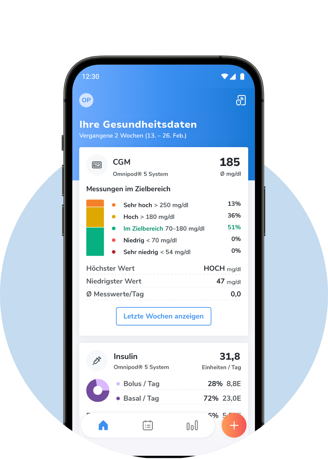 Mit einem Blick auf alle Ihre Gesundheitsdaten in der kostenlosen Glooko Mobile App können Sie besser verstehen, was Ihren Diabetes beeinflusst.